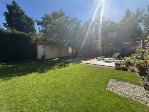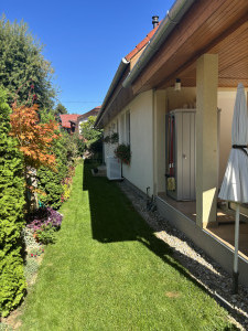 A kertben található egy kis tároló házikó(15m2), ami szerszámok esetleg kerékpár tárolásra alkalmas, ezen kívül egy burkolt napozóterasz is van ami esetleg medence vagy jakuzzi felállítására is alkalmas! A telken fúrt kút és öntöző berendezés van telepítve.